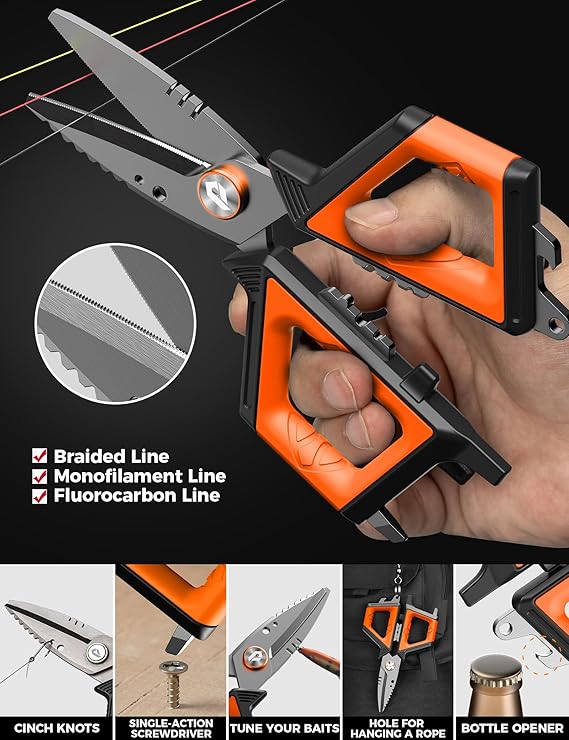 • The Fishing Scissors are 6.2 inches in size and fit large hands well.It can cut through braided line, fluorocarbon, PE, thick nylon, and stiff thread without fraying or damaging the line.