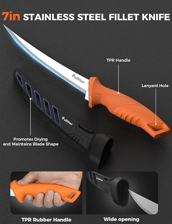 • 7-Inch Fillet Knife: The Fillet Knife is very flexible and super sharp,with a very easy to use rubber grip. The protective sheath is made of a rigid plastic with a safety latch to keep the sheath from sliding off of the blade while handling the knife.